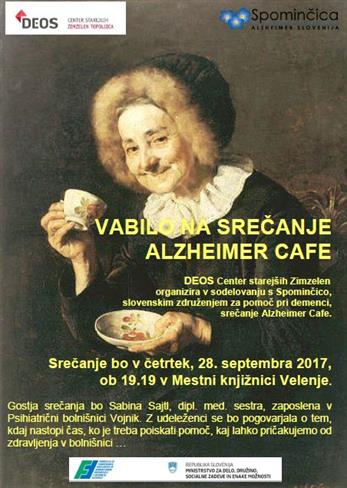 DEOS Center starejših Zimzelen organizira v sodelovanju s Spominčico – Alzheimer Slovenija v četrtek, 28. 09. 2017, Alzheimer Cafe ob 19.19 uri v Mestni knjižnici Velenje. Sabina Sajtl, dipl. med. sestra bo predavala o tem, kdaj nastopi čas, ko je treba poiskati pomoč, in kaj lahko pričakujemo od zdravljenja v bolnišnici.