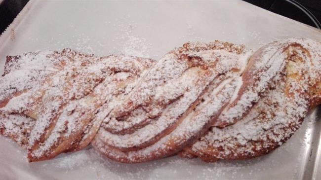 Testo premažemo z nadevom, zvijemo v rolado in ga prestavimo na pekač obložen s papirjem za peko. Rolado prerežemo po dolgem (režemo do dna), vendar na začetku pustimo pribl. 2 cm nerazrezano, da se nam kasneje ne bo razprla.